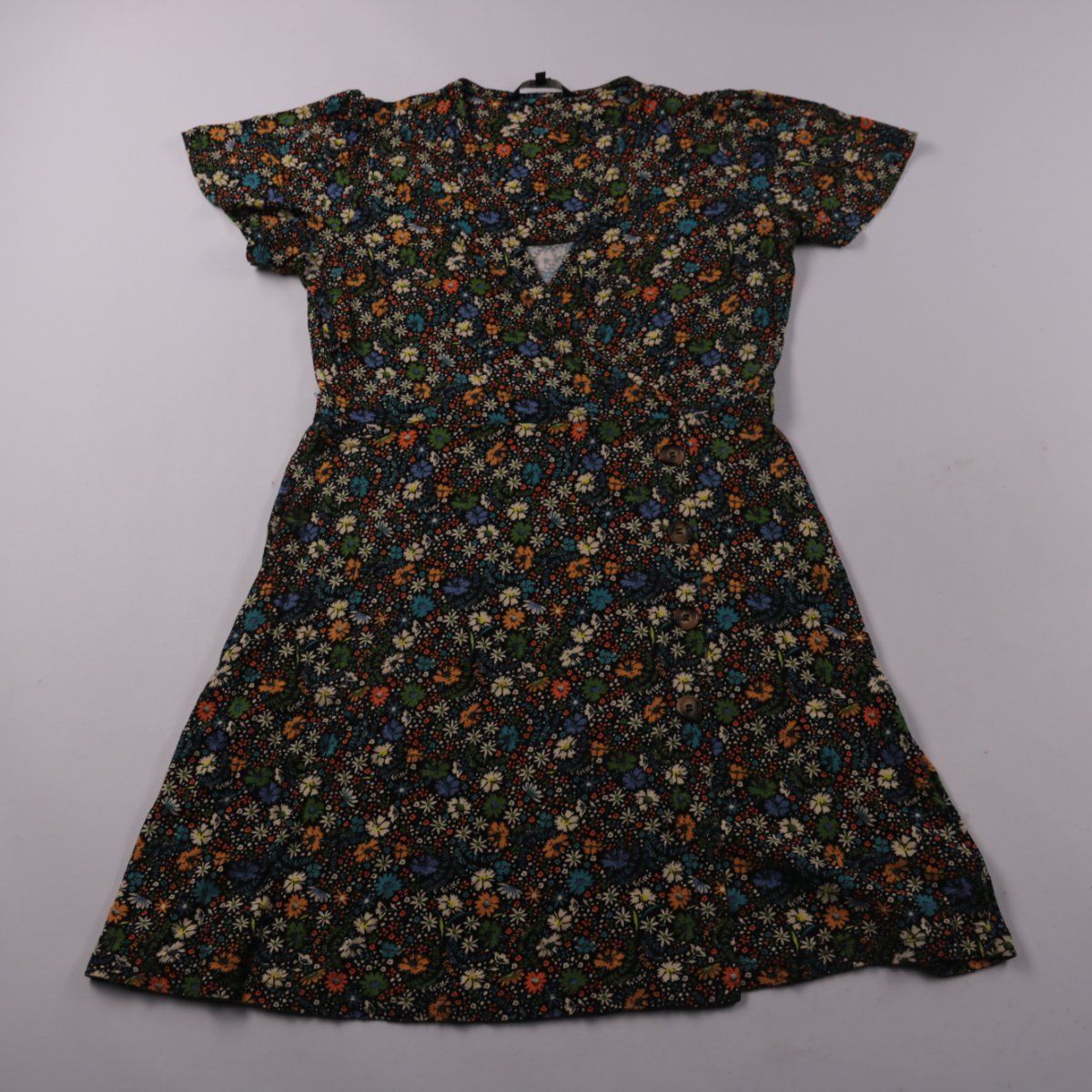Повседневное платье Next с цветочным принтом, V-образным вырезом и коротким рукавом. Подойдёт для прогулок и на каждый день в тёплую погоду. Ткань с добавлением эластана чуть тянется и комфортно садится по фигуре.
