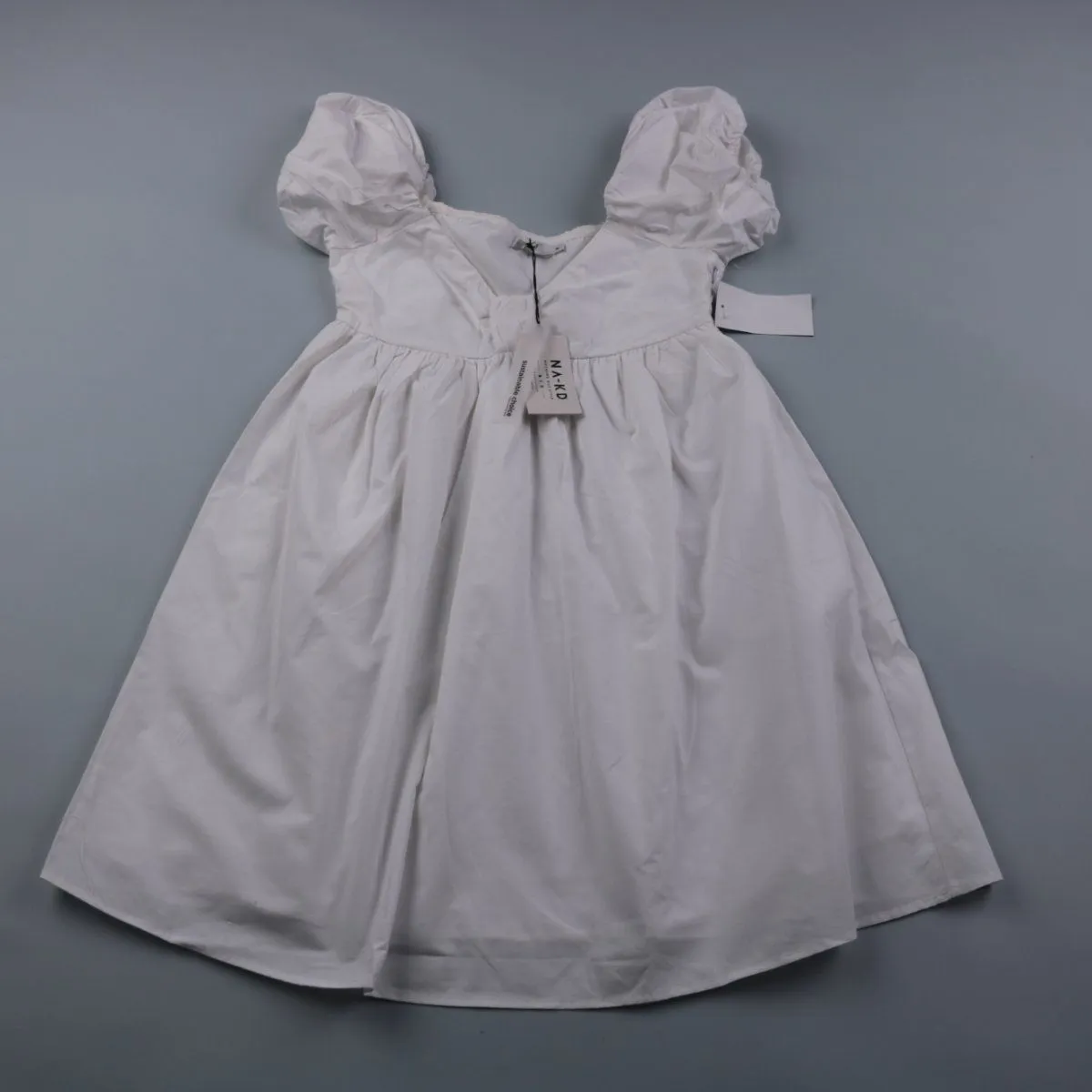 Повседневное платье NA-KD белого цвета из хлопка, с V-образным вырезом и объемными рукавами-фонариками. Подойдёт для летних прогулок и повседневных образов благодаря свободной юбке на сборке. Практичный плюс — натуральная ткань хорошо дышит и комфортна в жару.