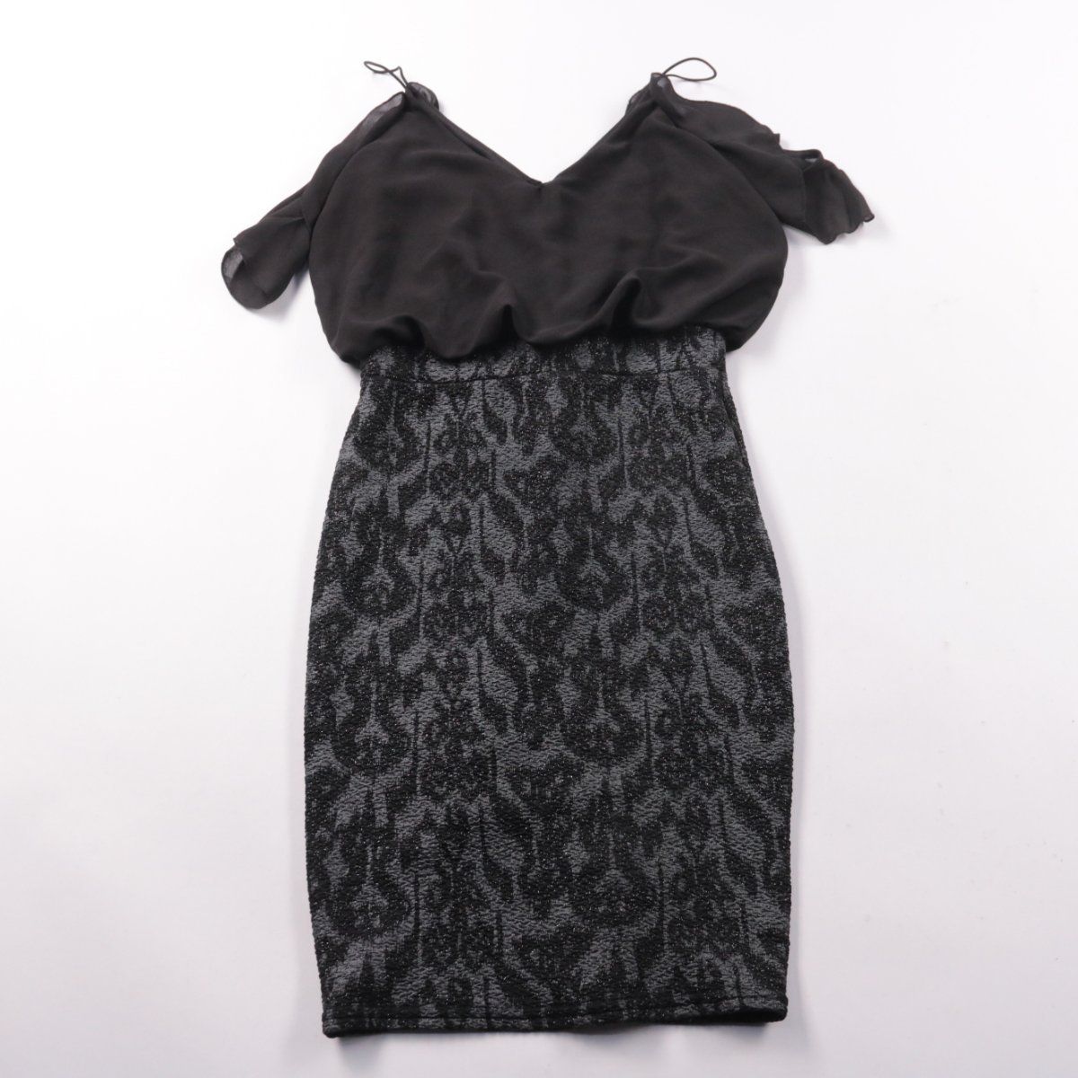 Женское платье TFNC с открытыми плечами и V-образным вырезом, верх из гладкой ткани и юбка-карандаш с серо-чёрным узором. Подойдёт для вечернего выхода или коктейльного мероприятия. Эластичный материал хорошо садится по фигуре и не сковывает движения.
