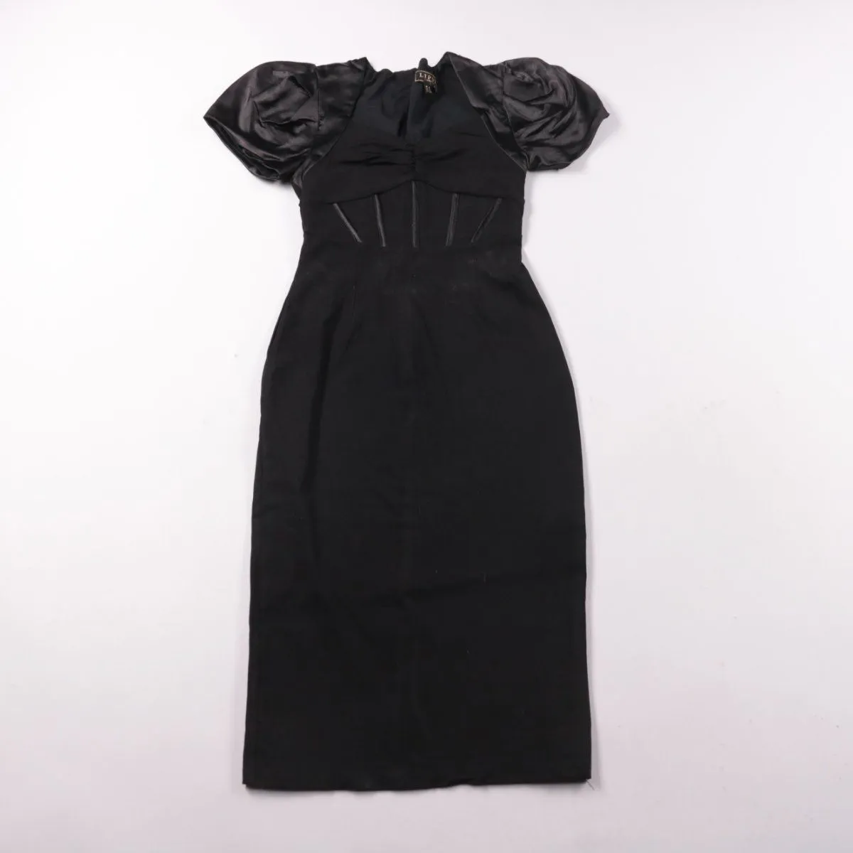 Вечернее платье Lipsy в чёрном цвете с корсетным лифом и объёмными рукавами-фонариками. Подойдёт для коктейльных вечеринок, свиданий и мероприятий, когда хочется акцентировать силуэт. Эластичная ткань комфортно садится по фигуре и не сковывает движения.