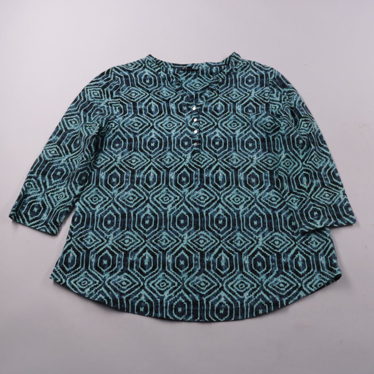Блузка Dash с геометрическим принтом и планкой на пуговицах, длинный рукав. Подойдёт для повседневных образов и офиса в сочетании с джинсами или брюками. Хлопок с добавлением эластана слегка тянется и комфортен в носке.