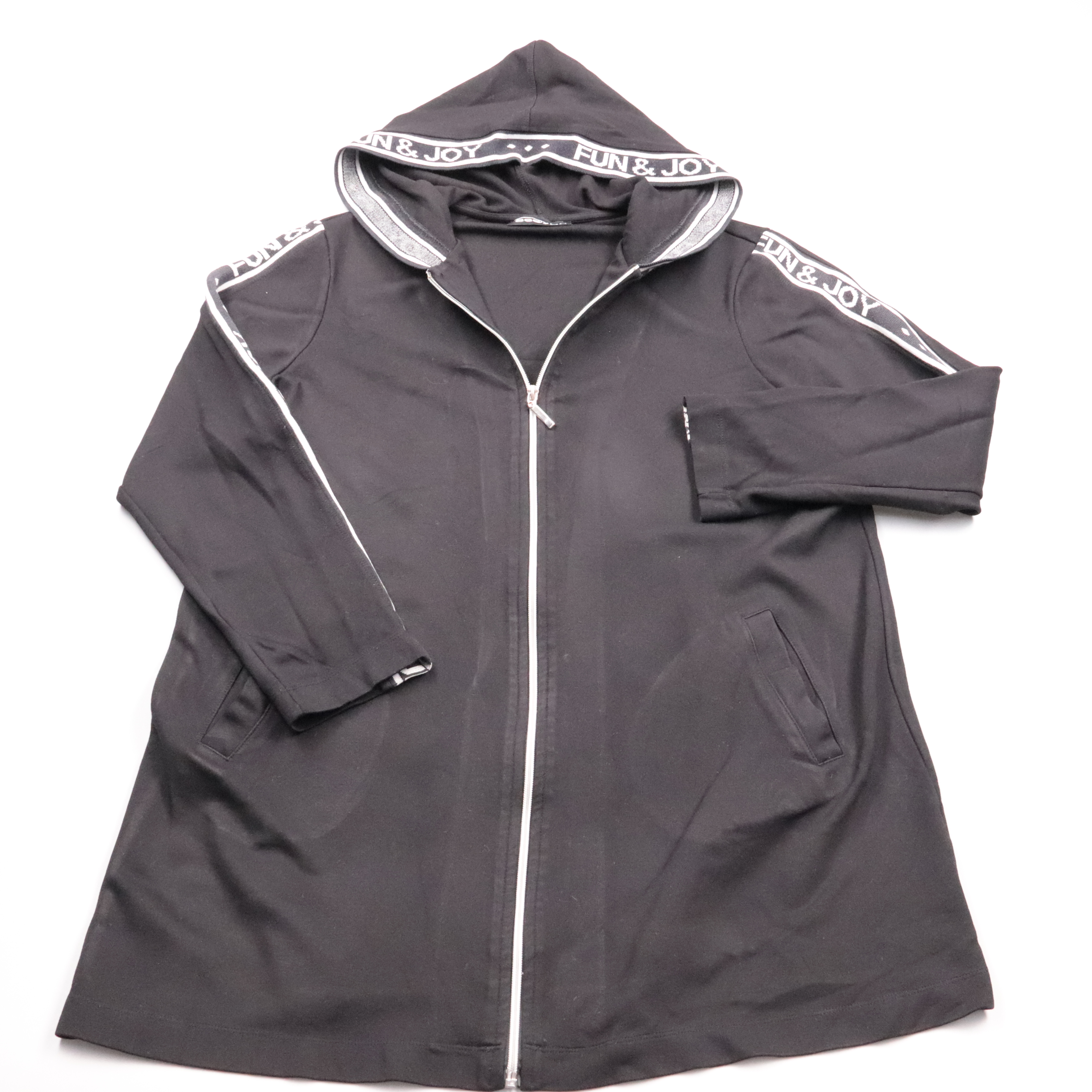 Толстовка See You на молнии с капюшоном, в чёрном цвете и с контрастной тесьмой «FUN&JOY» по плечам. Подойдёт для повседневных прогулок и поездок, когда нужна удобная вещь на слой. Практичный плюс — эластичная ткань хорошо тянется и не сковывает движения.