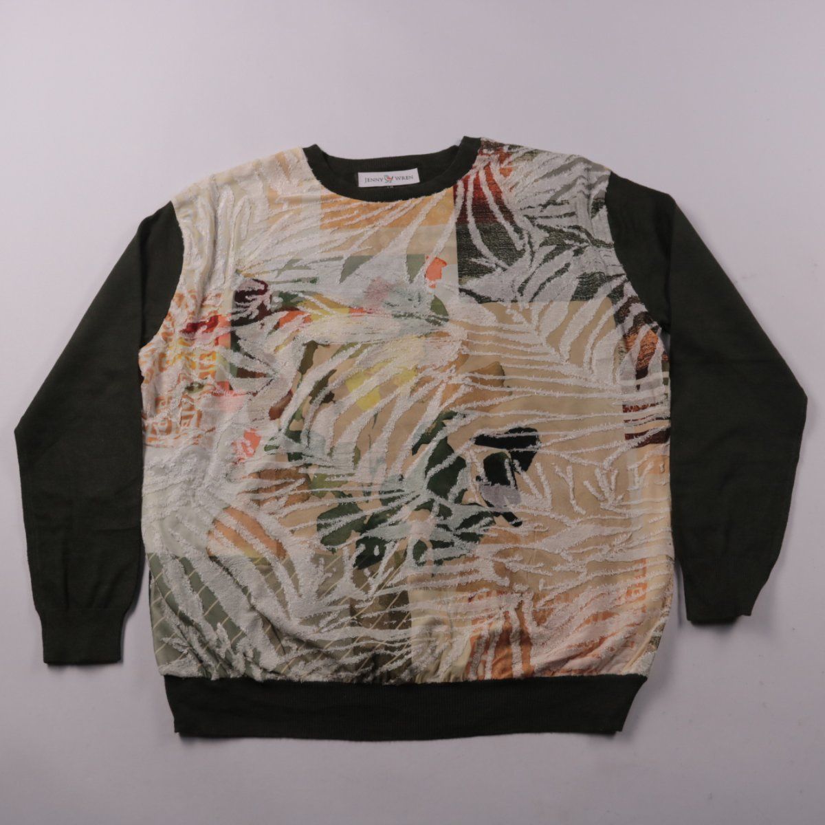 Свитшот Jenny Wren с круглым вырезом и контрастными тёмными рукавами. Спереди разноцветный узор в бежево-хаки гамме — подойдёт для повседневных образов и прогулок. Трикотажные манжеты и пояс помогают держать форму и комфортно садятся по фигуре.
