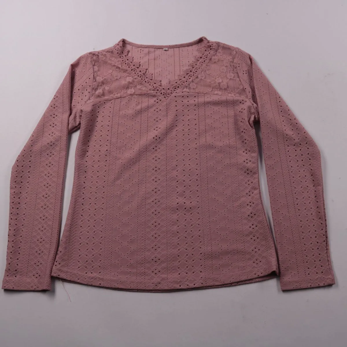Женский ажурный лонгслив с V-образным вырезом и кружевной отделкой, бренд не указан. Подойдёт для повседневных образов в прохладную погоду, хорошо смотрится с джинсами и юбками. Ткань тянется и комфортно садится по фигуре.
