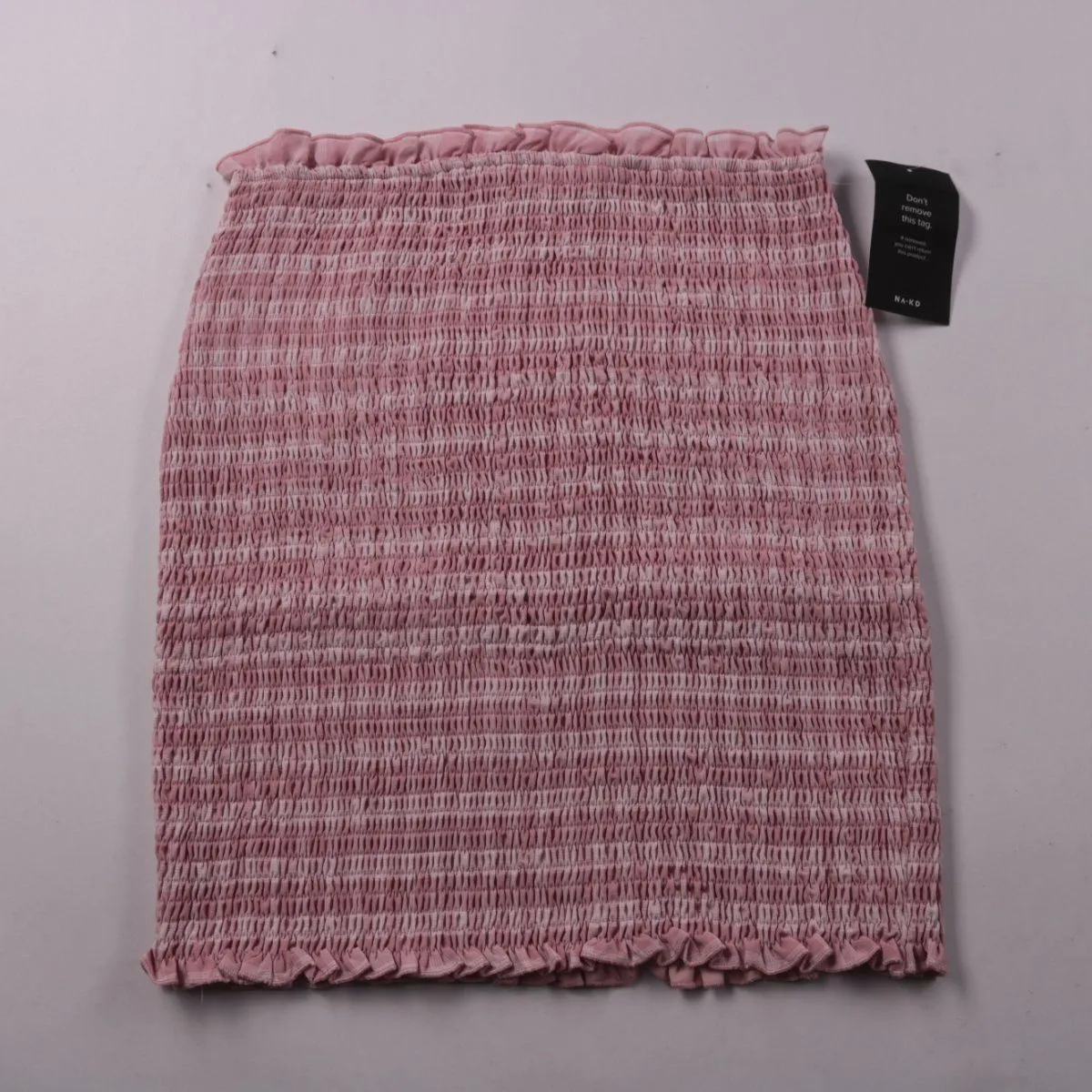 Топ NA-KD без бретелей из эластичной смокированной ткани, пудрово-розового цвета с оборками по краям. Подойдёт для летних образов с джинсами, шортами или юбками. Материал хорошо тянется и комфортно садится по фигуре.