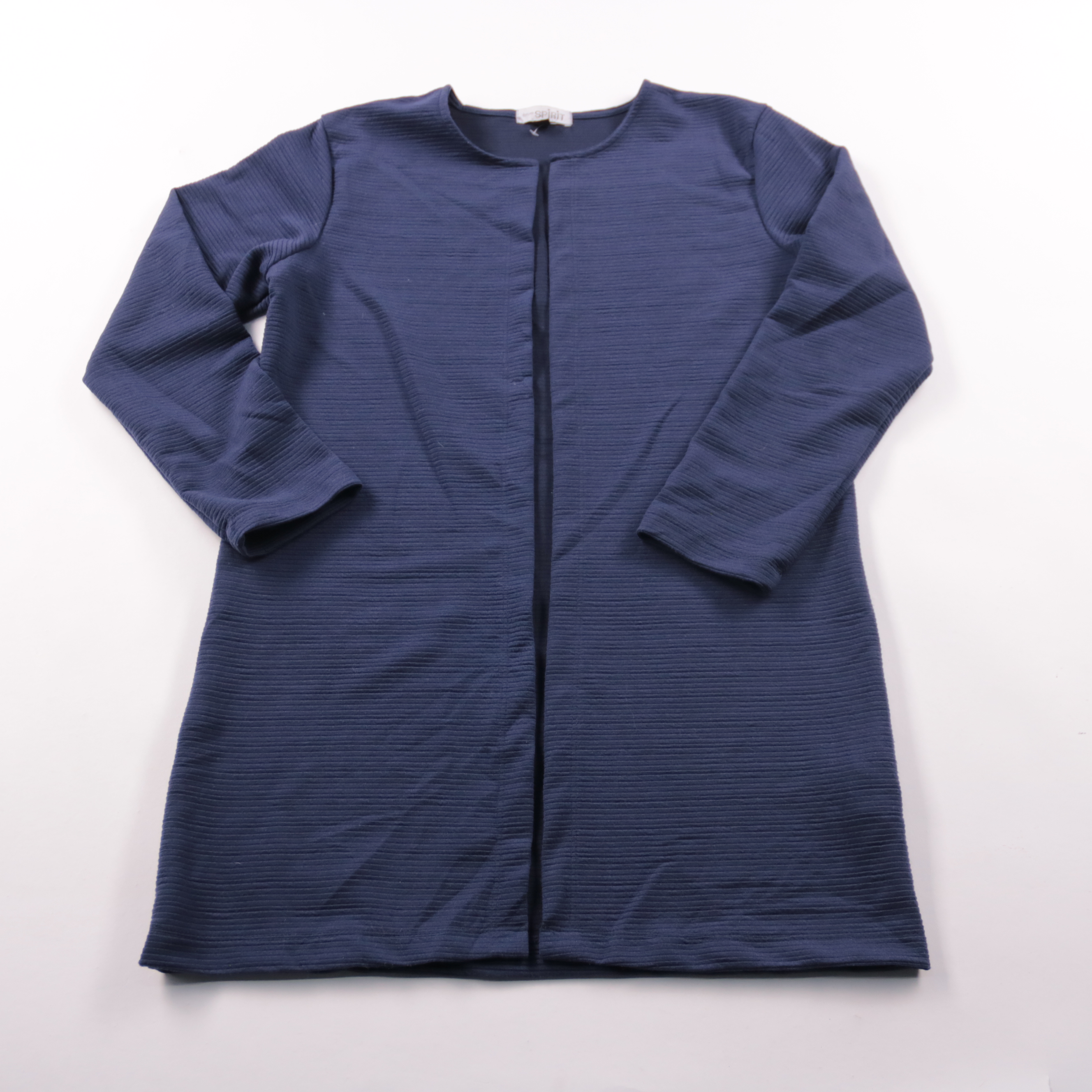 Пальто Spirit тёмно-синего цвета, лёгкое и без застёжки, с лаконичным прямым силуэтом. Подойдёт для офиса и повседневных образов в межсезонье, удобно носить поверх блузки или тонкого свитера. Материал слегка тянется и не сковывает движения.