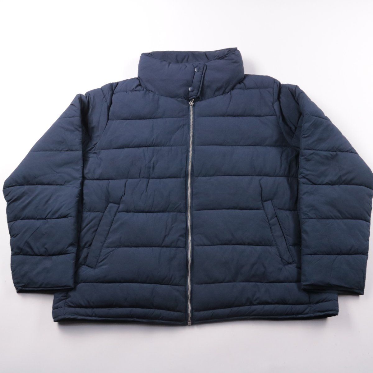 Стёганая зимняя куртка Gina тёмно-синего цвета с высоким воротником-стойкой и застёжкой на молнию. Подойдёт для повседневной носки в холодную погоду и поездок по городу. Лёгкая и тёплая за счёт объёмного утеплителя, есть карманы.