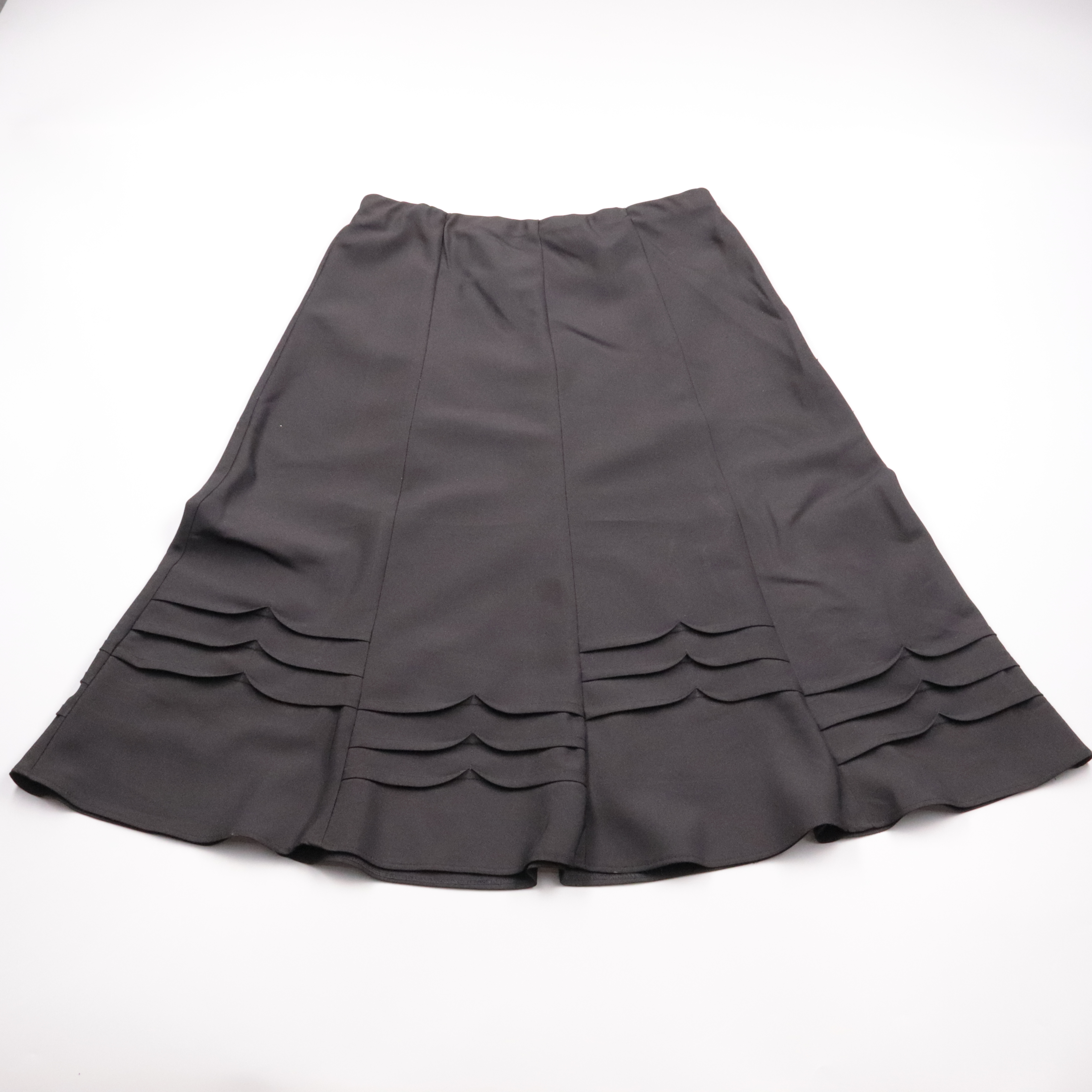 Юбка Bm чёрного цвета с расклешённым силуэтом и декоративными воланами по низу. Подойдёт для офиса и повседневных образов с блузкой или свитером. Практичный плюс — лёгкий полиэстер почти не мнётся и быстро сохнет.